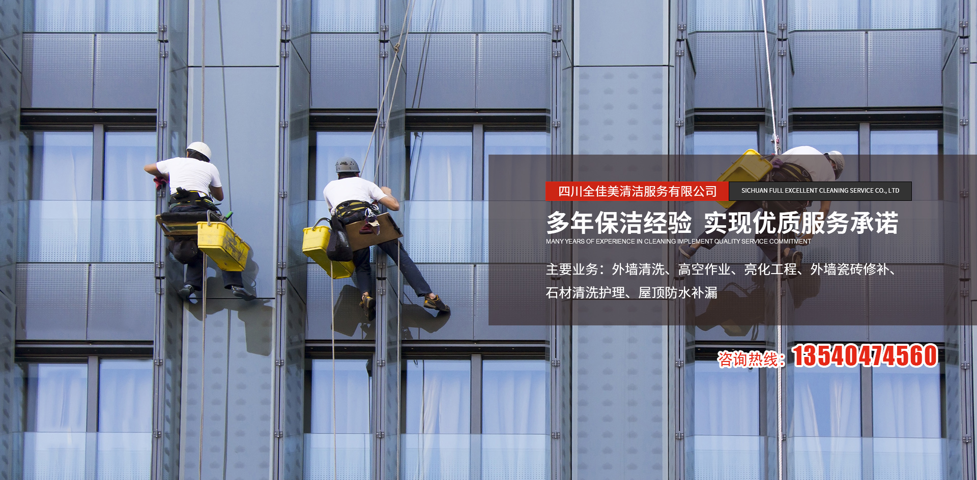 四川全佳美清潔服務(wù)有限公司成立于2017年11月20日,注冊資本200萬元人民幣,是一家專業(yè)從事高空外墻清洗,外墻維修,開荒保潔,石材養(yǎng)護(hù),外墻防水等一體化的工程服務(wù)公司。公司先后服務(wù)于成都鐵路培訓(xùn)學(xué)校,雙流空港酒店,省體育館等寫字樓及工業(yè)園區(qū)的外墻清洗保潔及維修服務(wù)。經(jīng)過多年的發(fā)展與努力,公司已具備一定的規(guī)模及實(shí)力。現(xiàn)擁有一支技術(shù)精湛的服務(wù)團(tuán)隊(duì),以高標(biāo)準(zhǔn)的服務(wù)品質(zhì),專業(yè)的安全技術(shù)實(shí)力,為全川不同群體的客戶提供更安全,更周到的清洗服務(wù)解決方案,期待與你的合作。